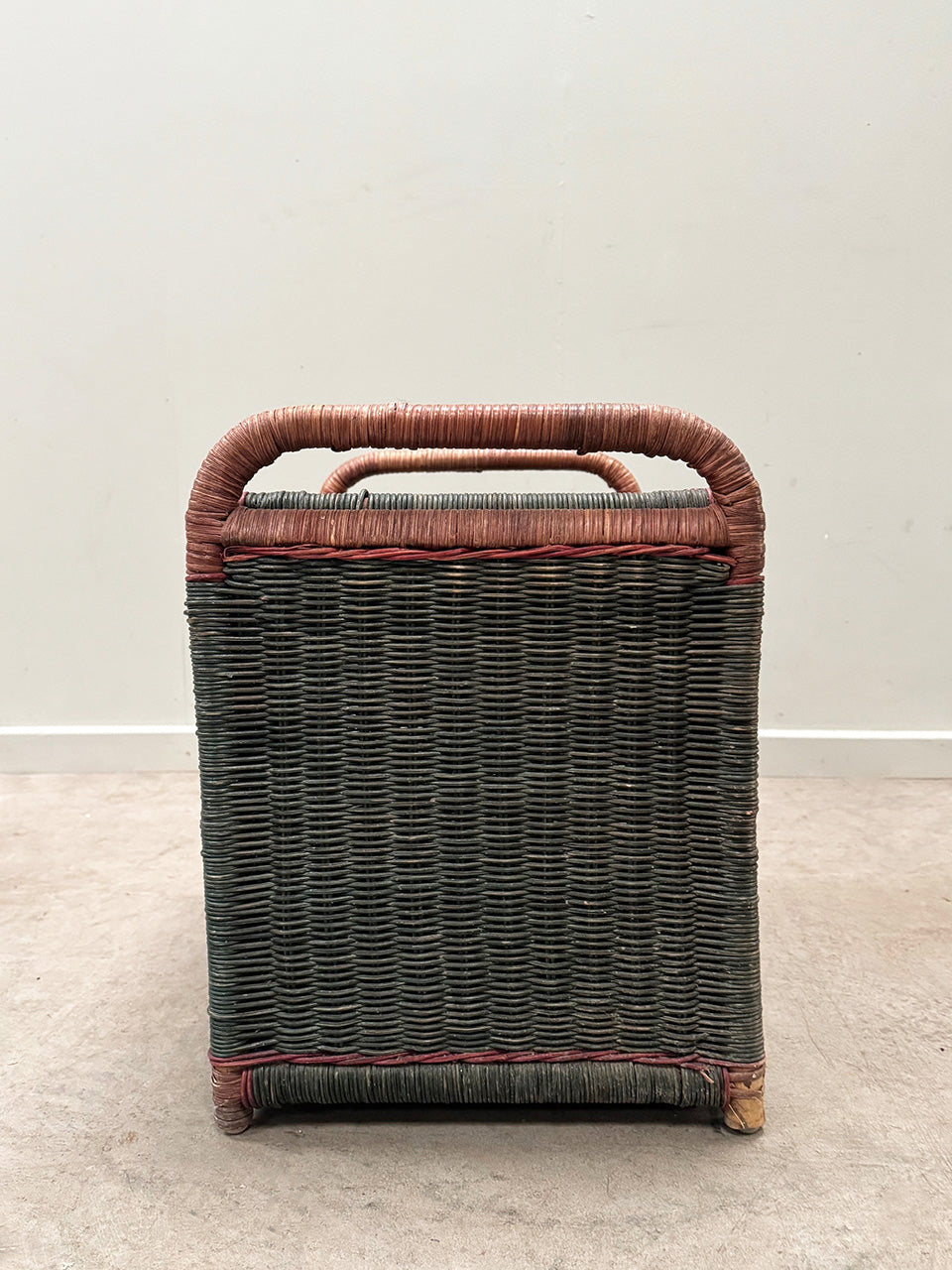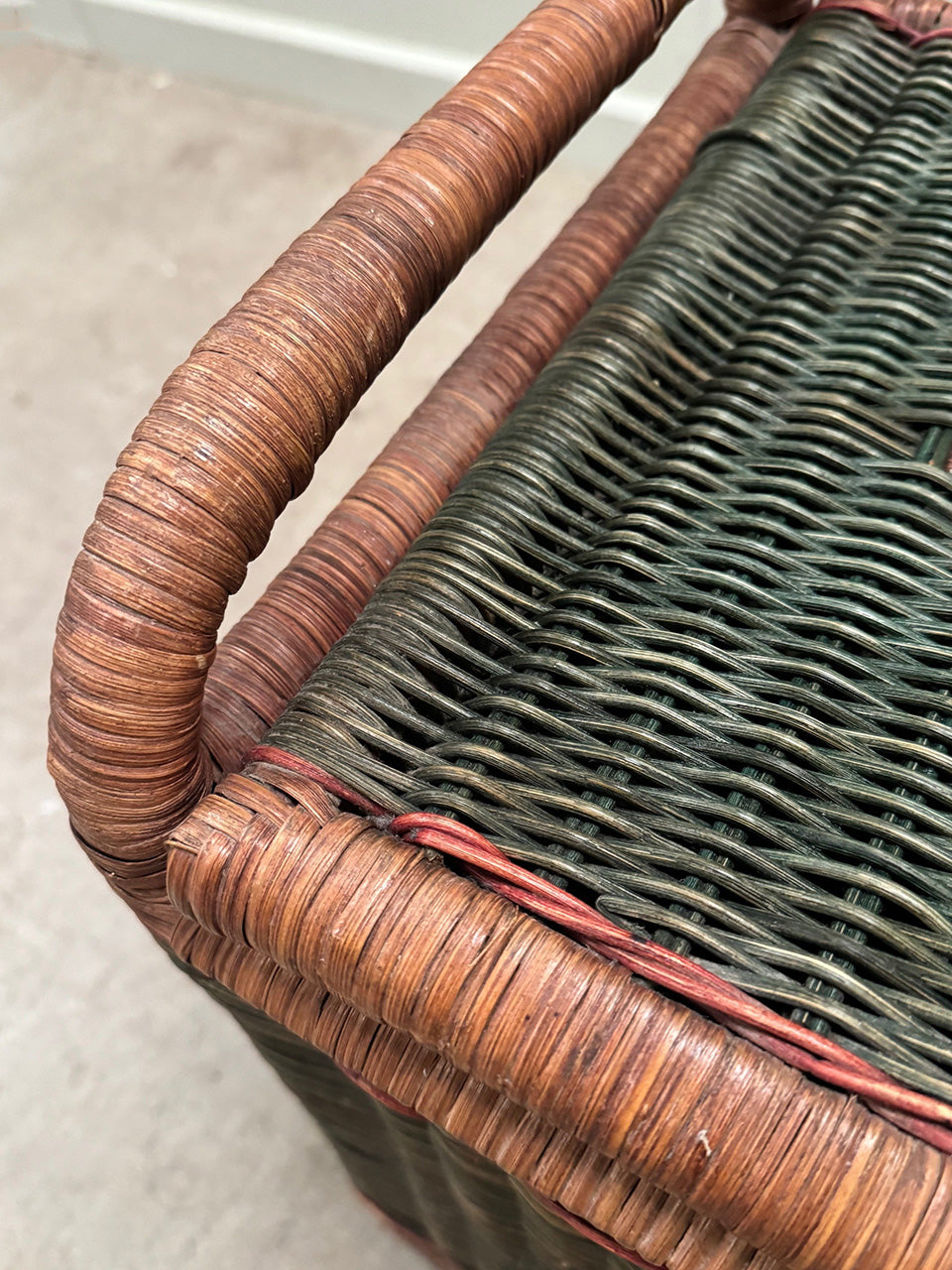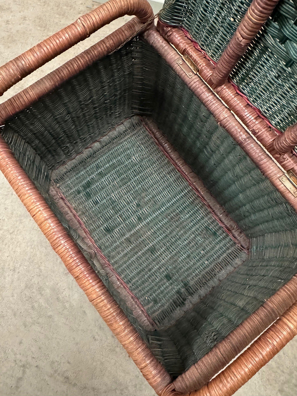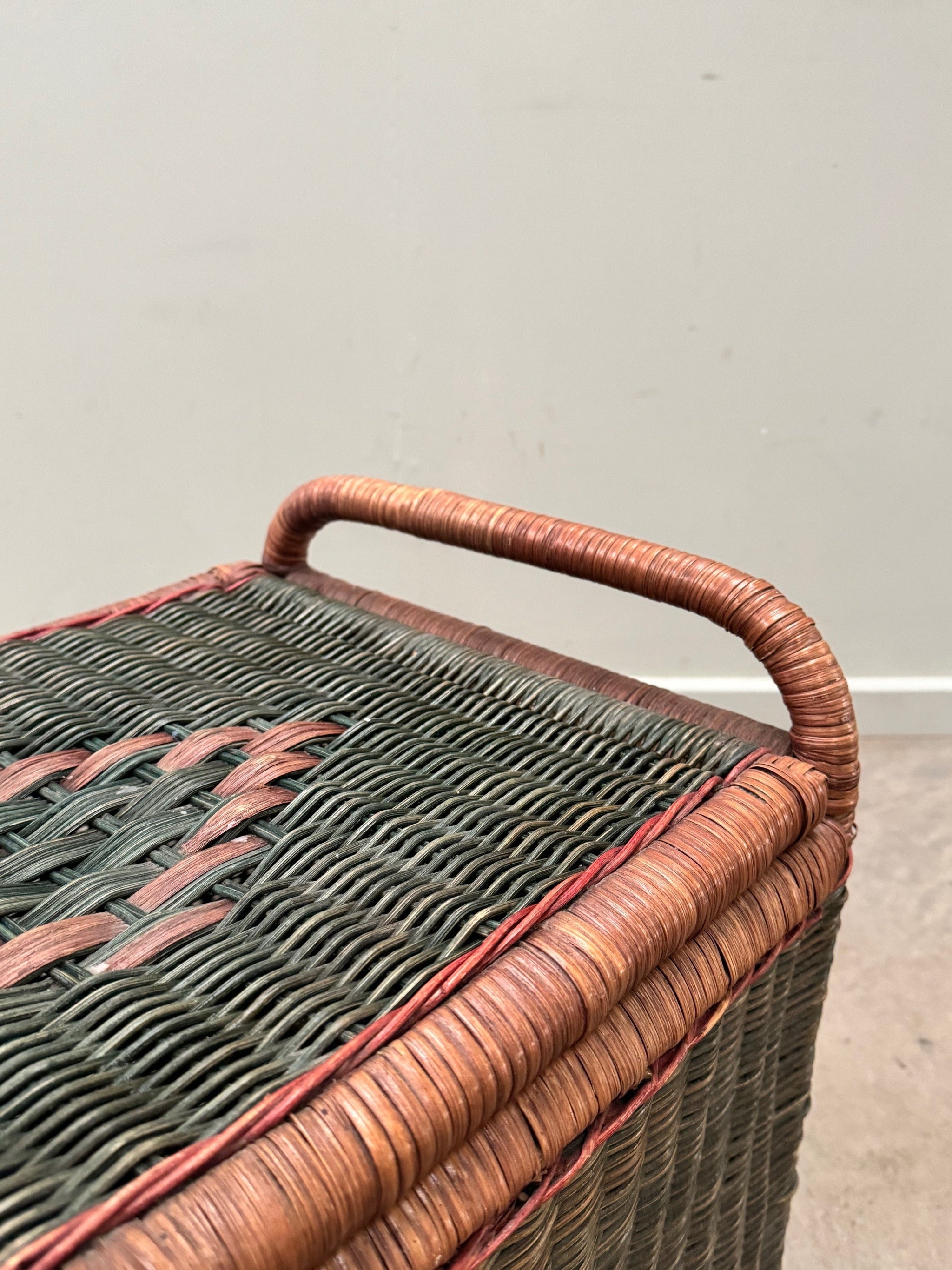 Compact green wicker storage box with lift up lid. There are 2 brass chains supporting the lid when open.