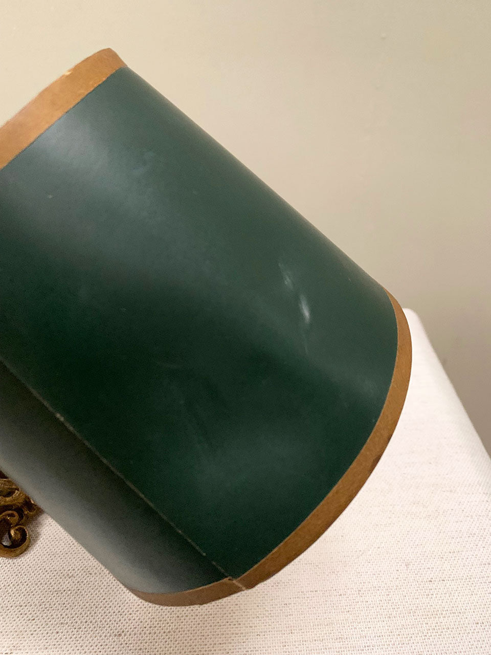 A sweet pair of 19th century, small sized table lamps with green clip on shades.