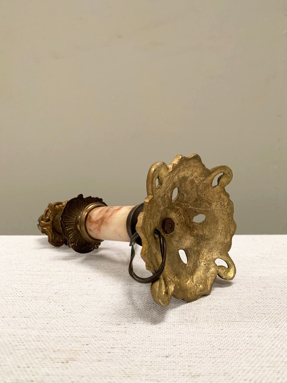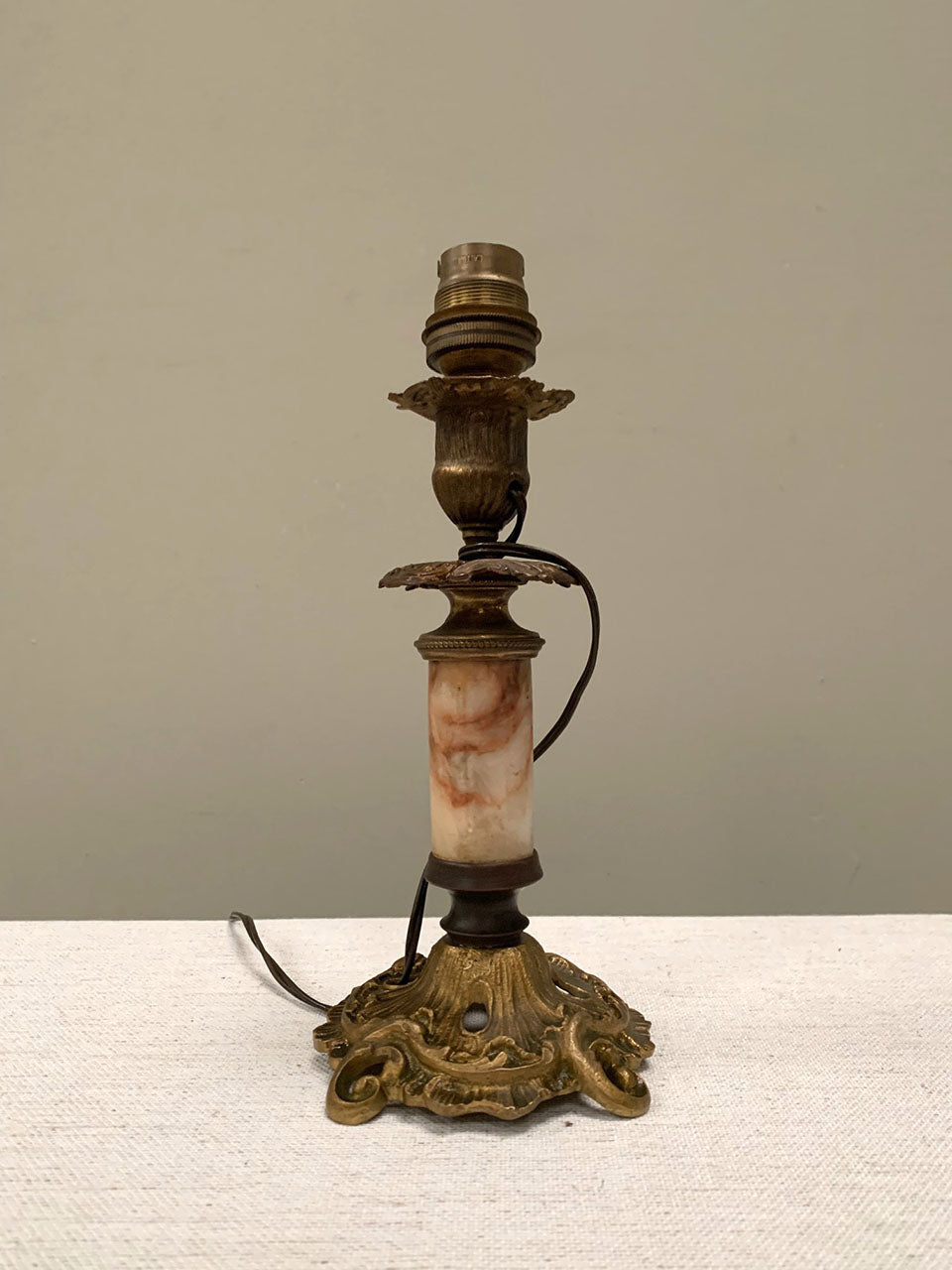 The lamps have open work brass bases, cream coloured and veined marble columns and brass candleholder tops.