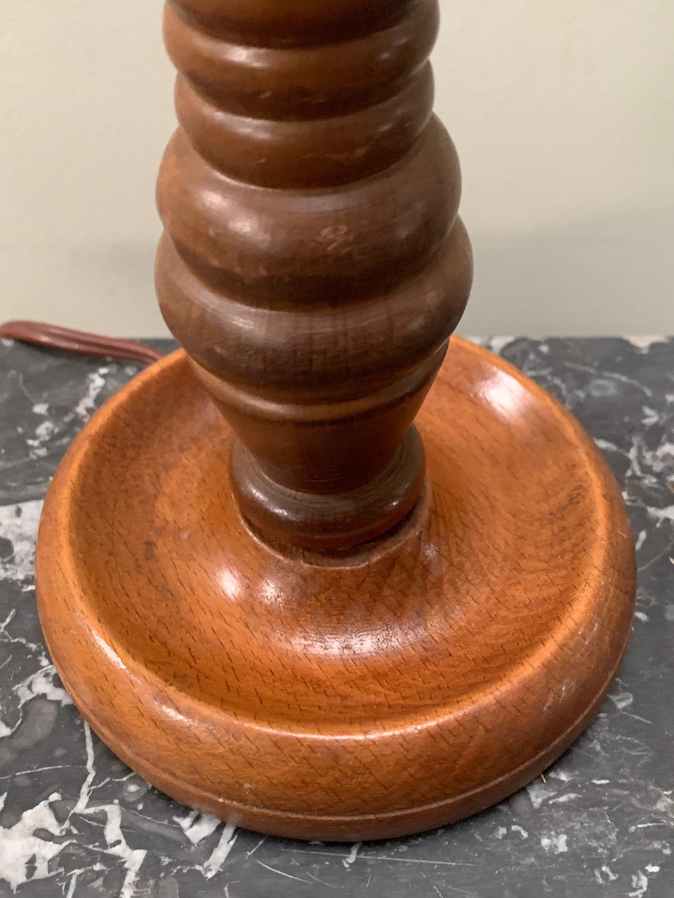 A small, turned wooden lamp base on a circular base in a mid-brown colour.