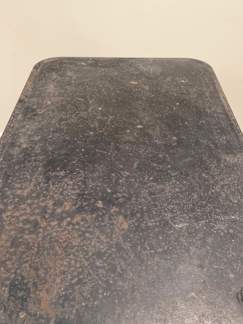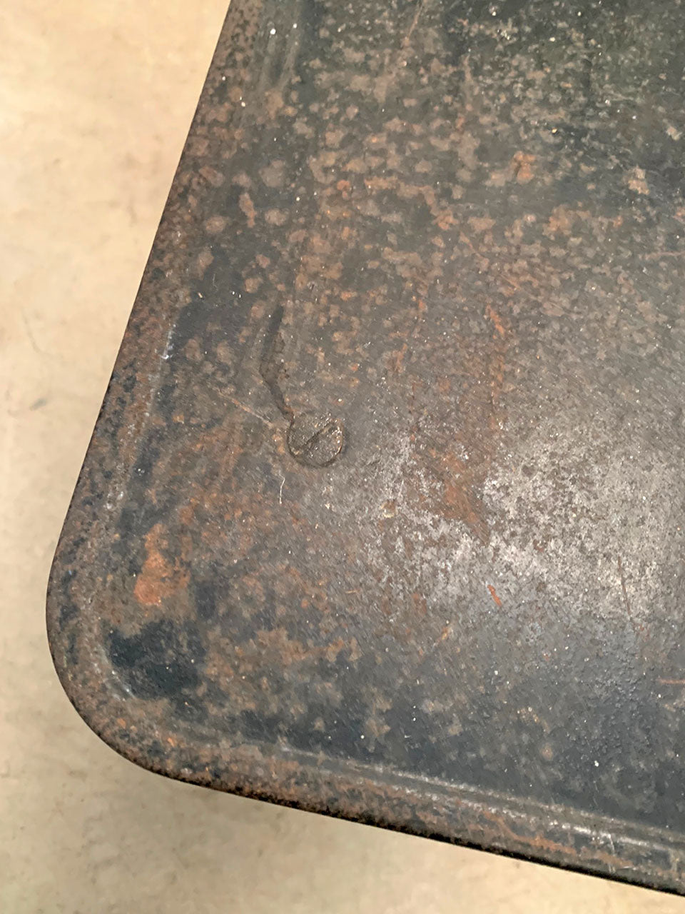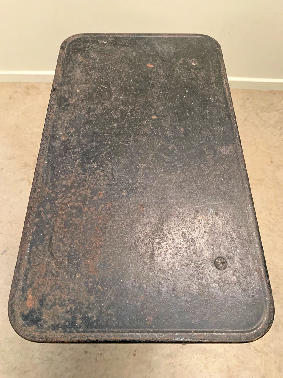 Set on curved sweeping feet, with a chrome base and metal top, showing signs of rust.
