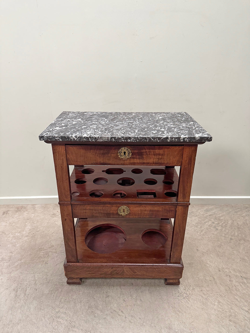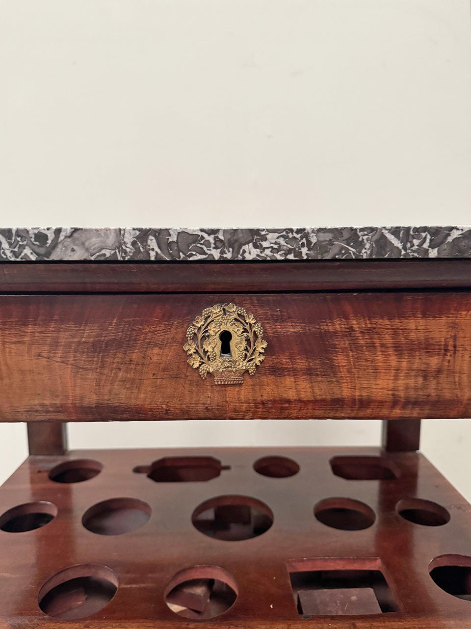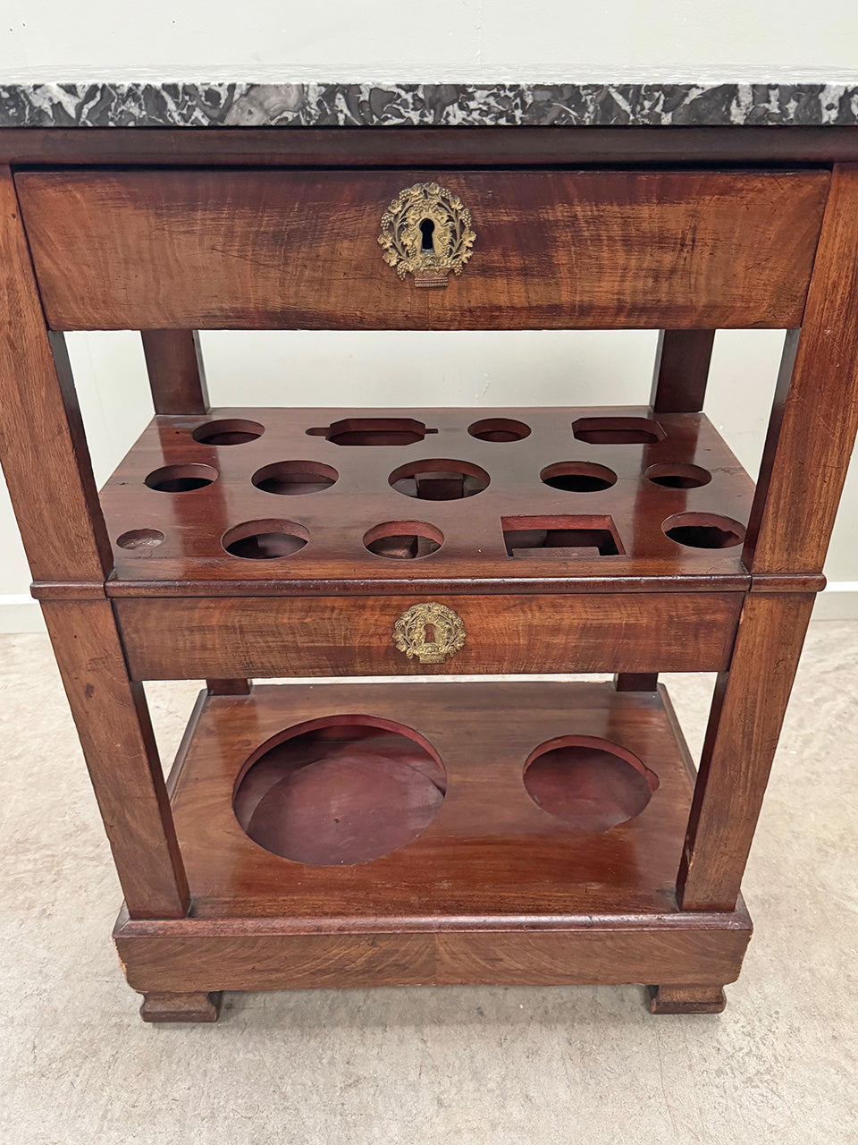 There is a drawer under the top, sadly the lock has been removed. The drawer in the middle section is a faux drawer.