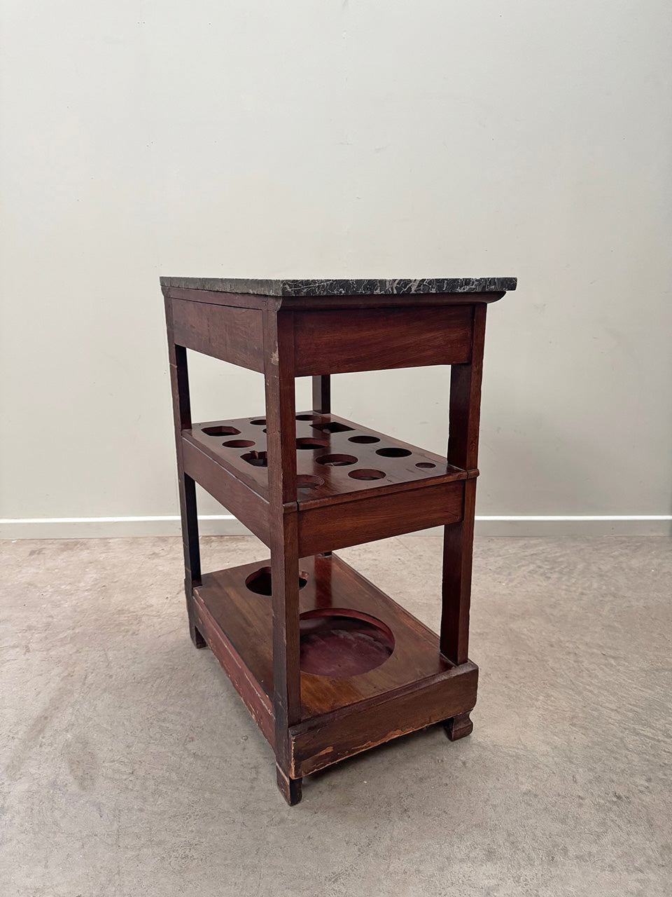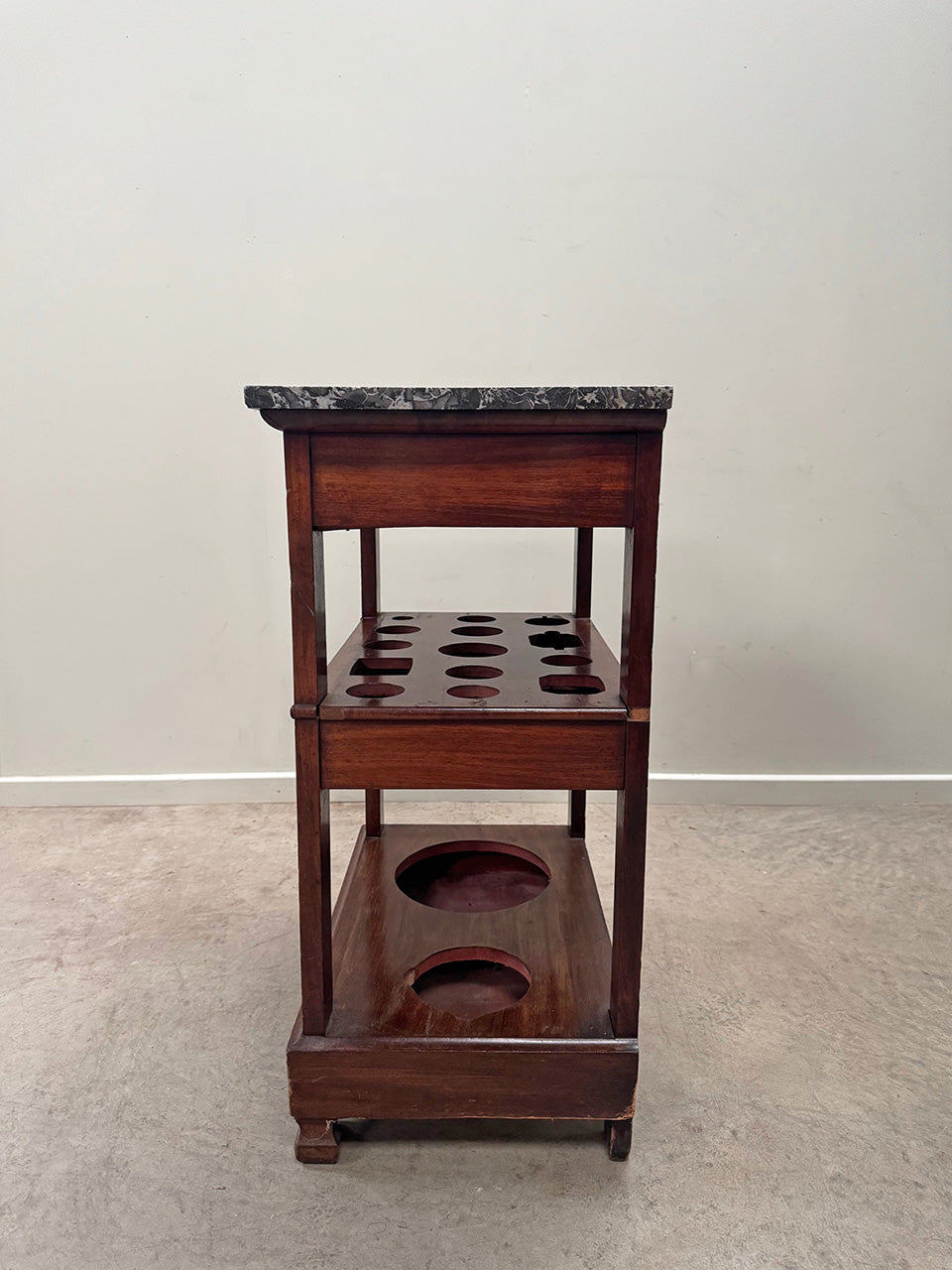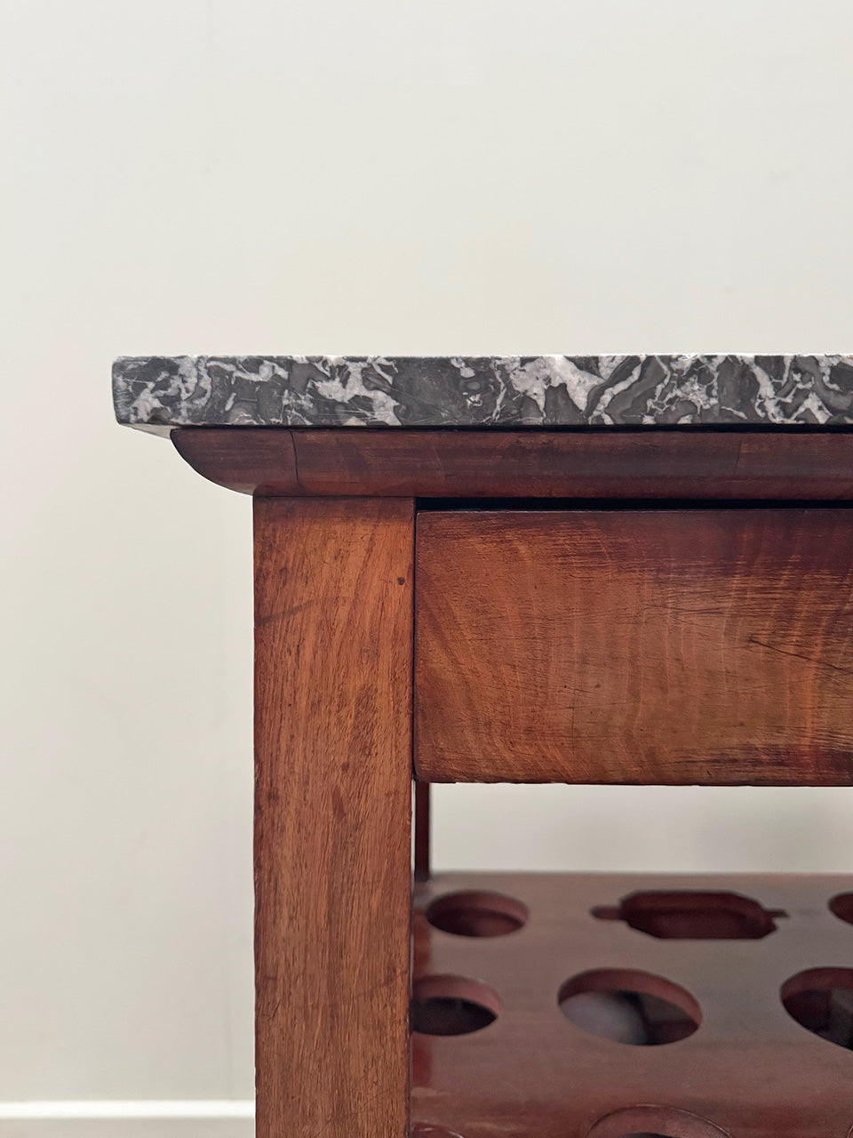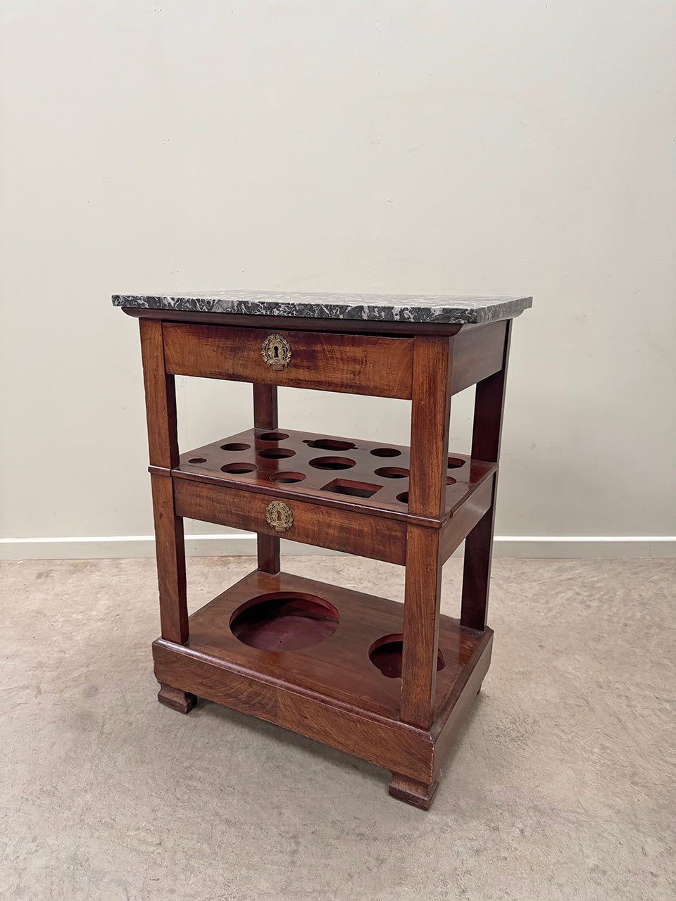 There is a drawer under the top, sadly the lock has been removed. The drawer in the middle section is a faux drawer.