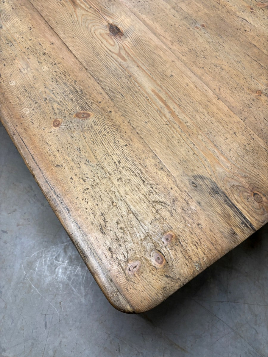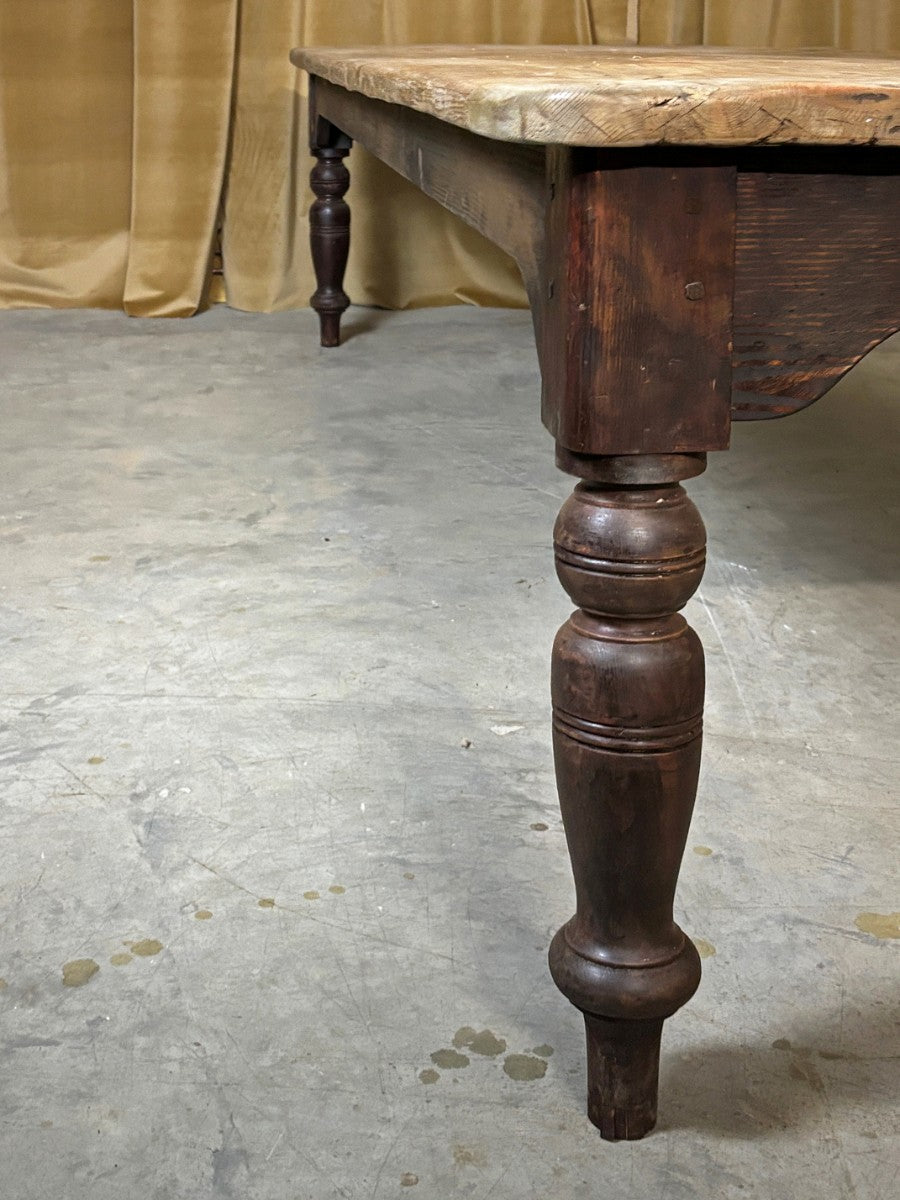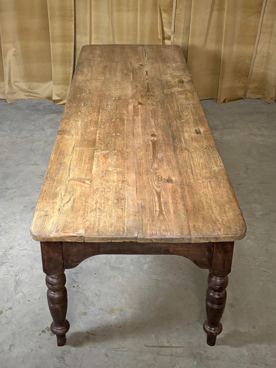 Great size and quality farmhouse kitchen table with a thick, 4 plank, scrubbed and worn pine top, standing on turned legs retaining original dark brown lacquer polish.
