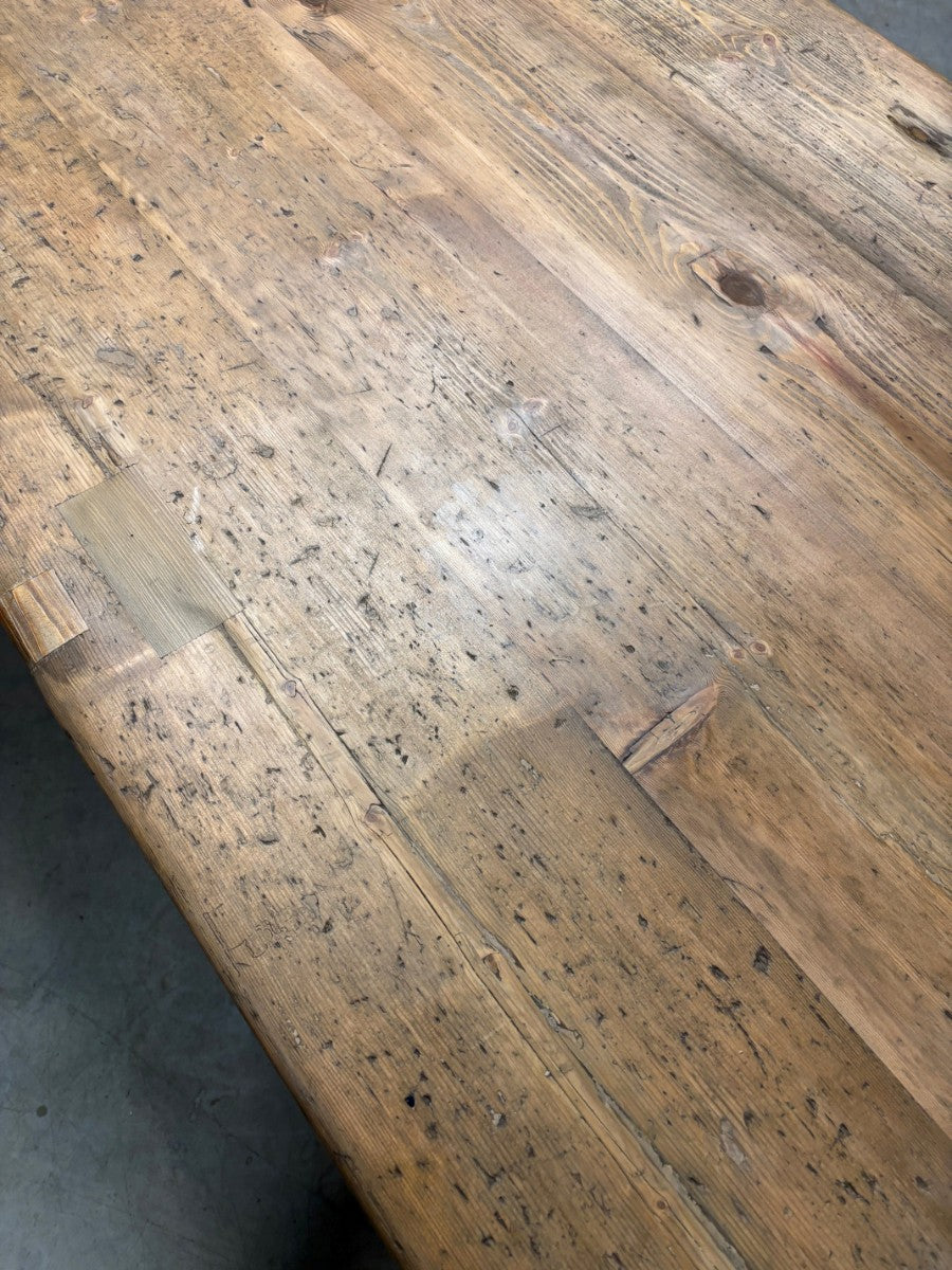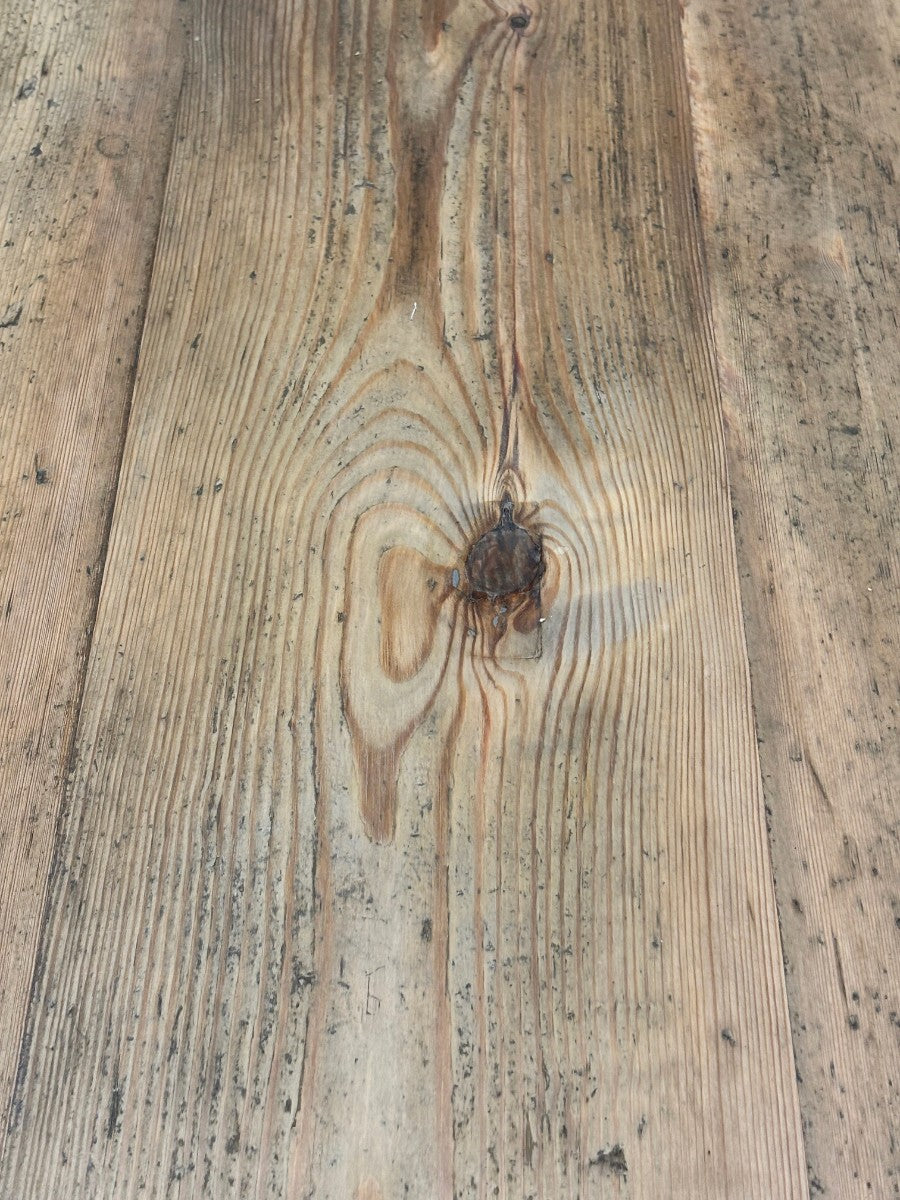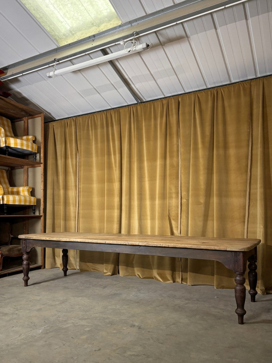 Great size and quality farmhouse kitchen table with a thick, 4 plank, scrubbed and worn pine top, standing on turned legs retaining original dark brown lacquer polish.