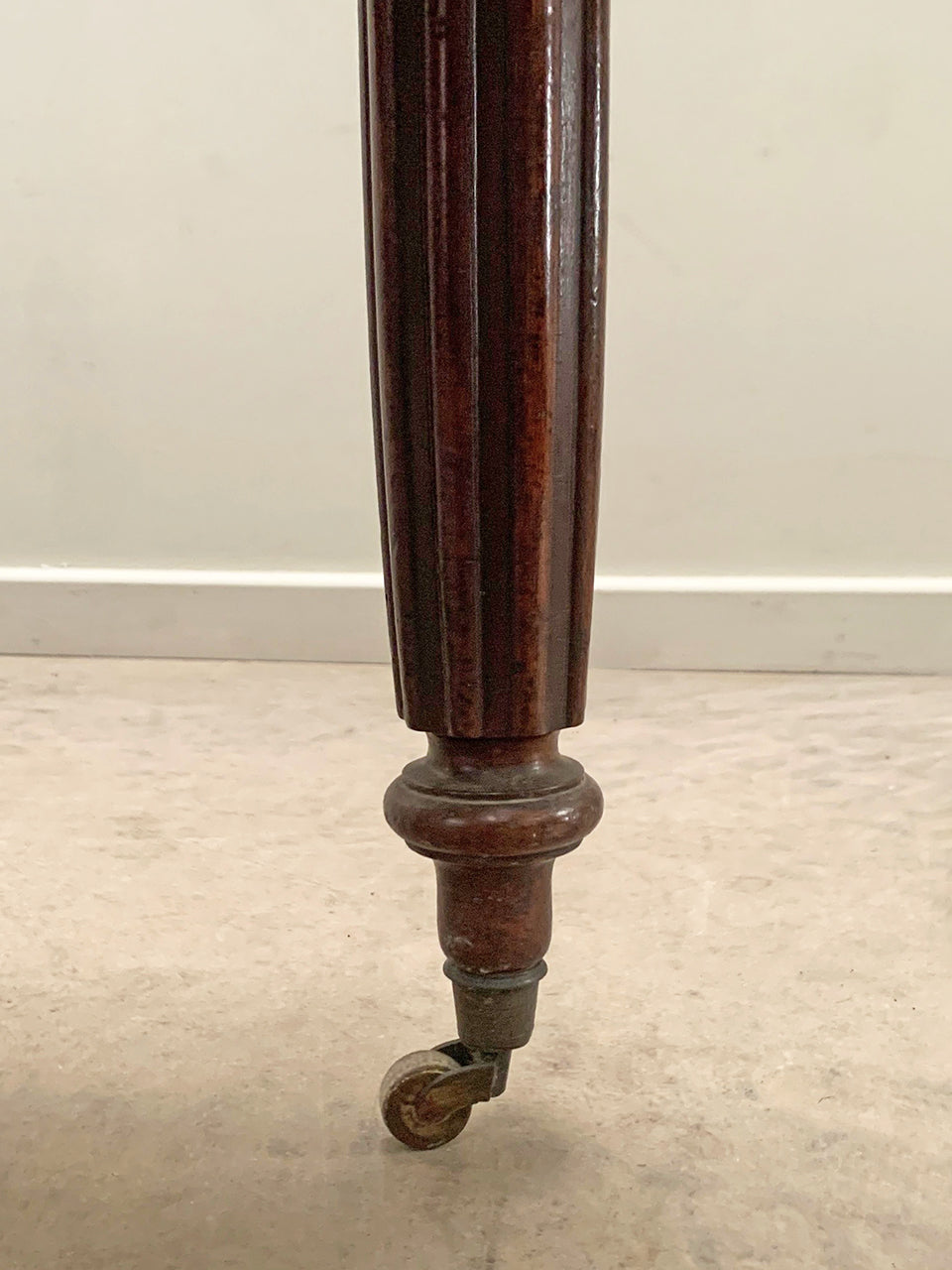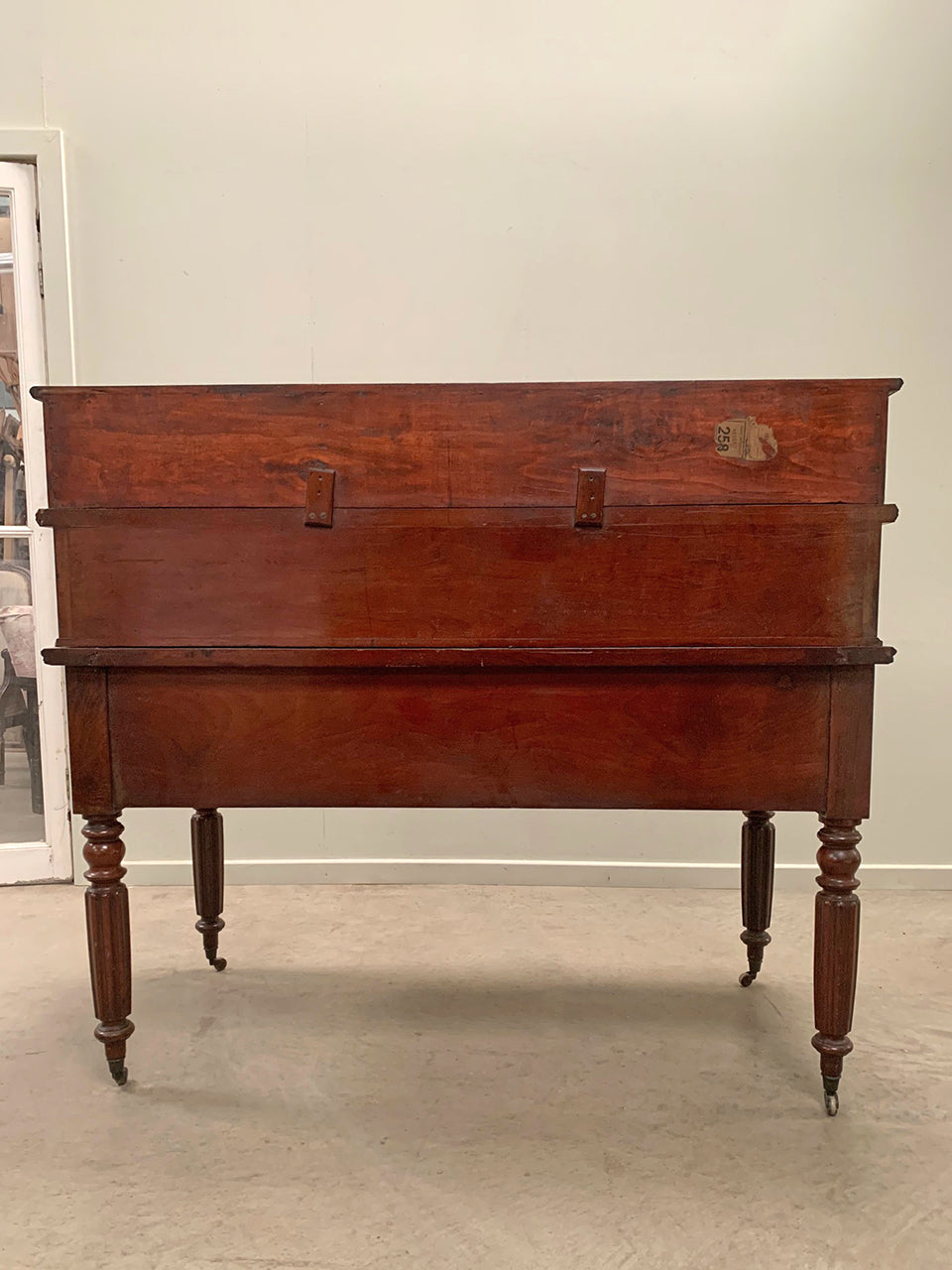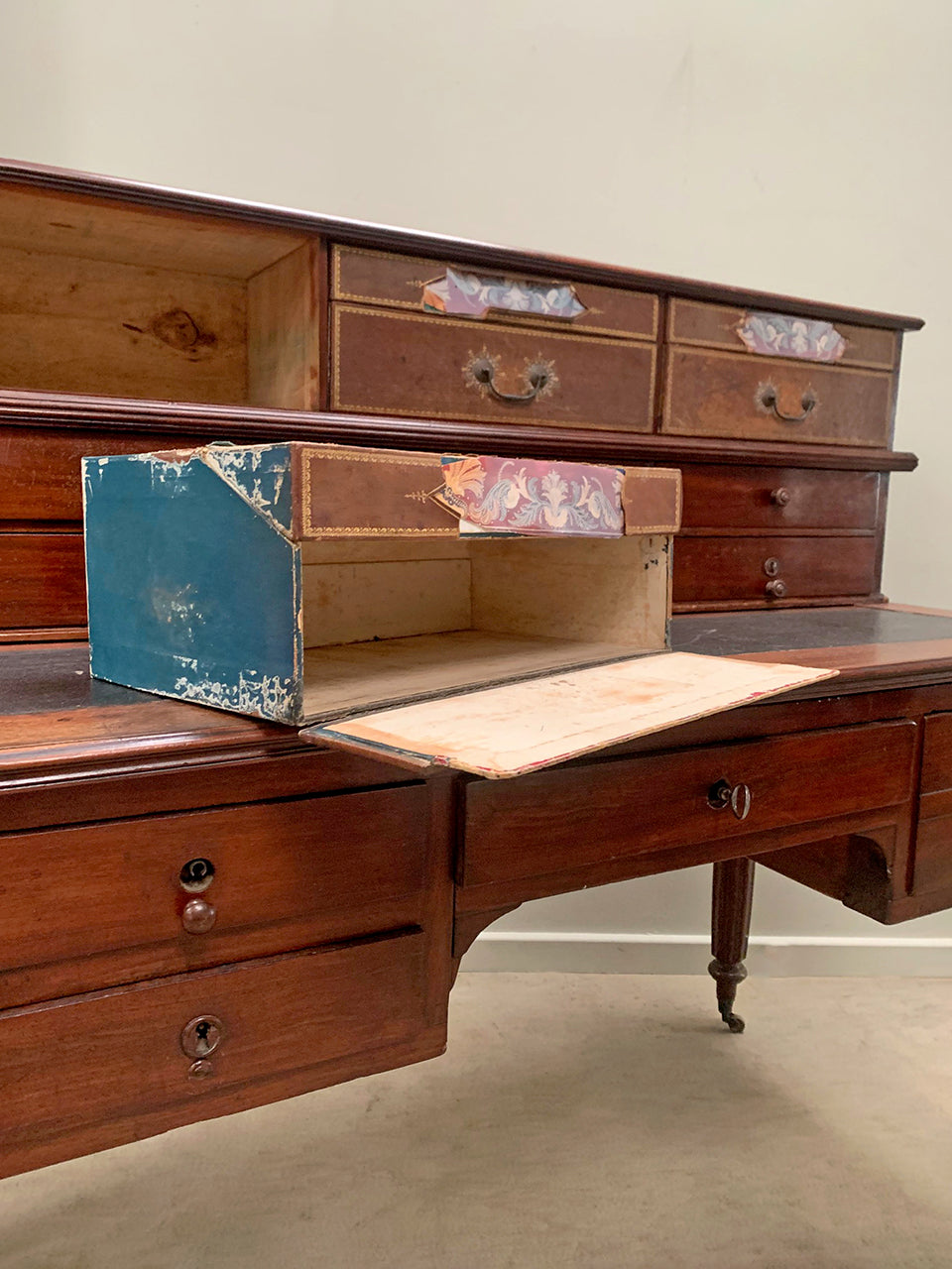 Superb 19th century mahogany desk with a black leather writing pad and storage drawer upright.