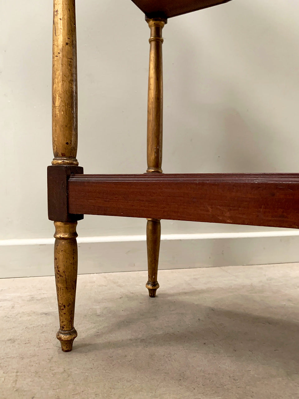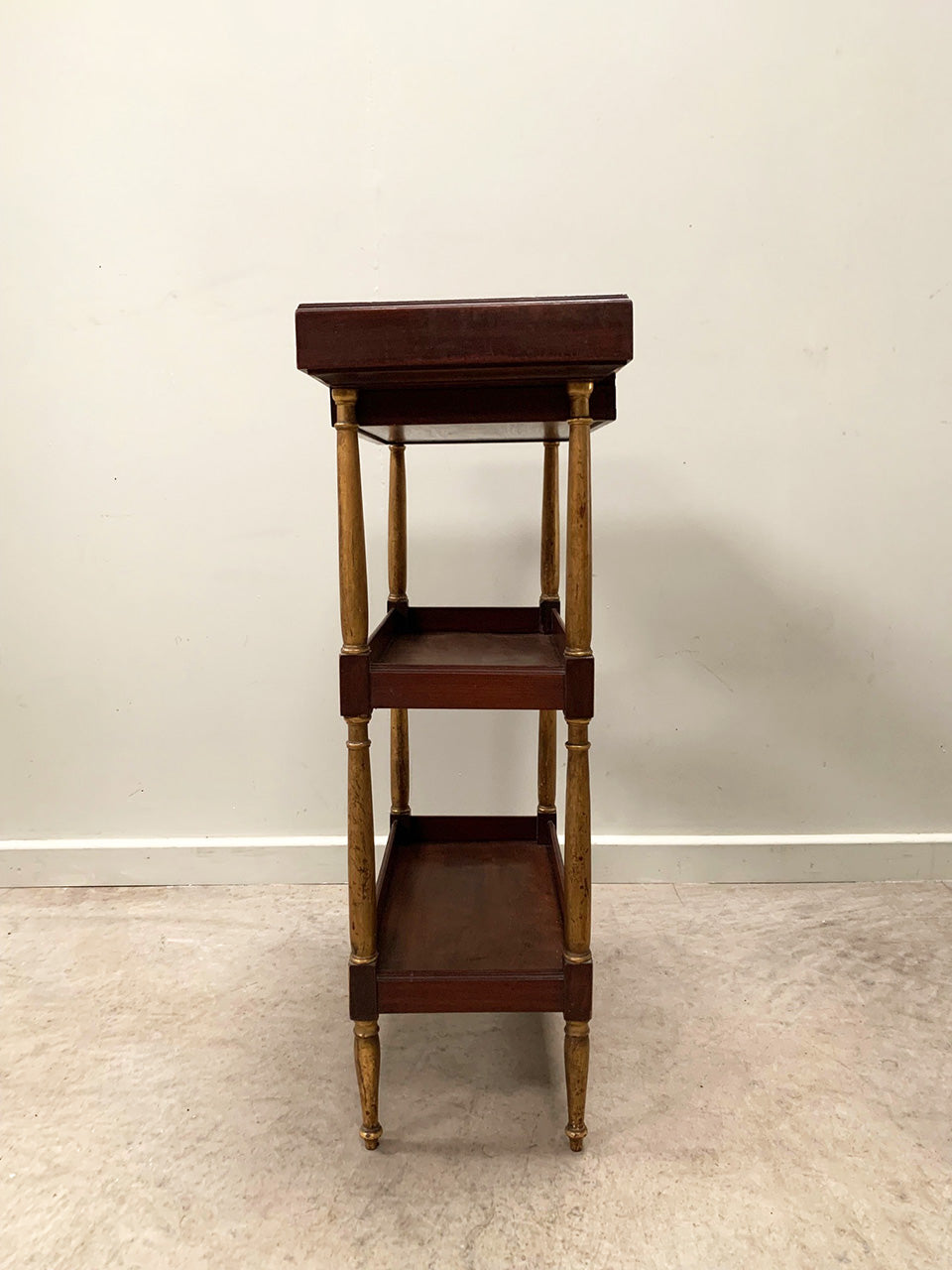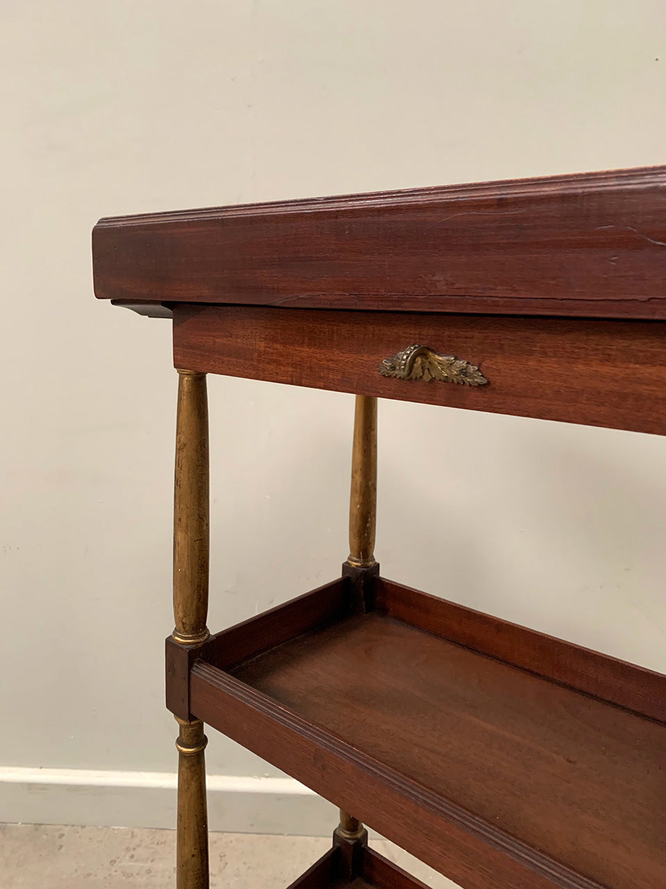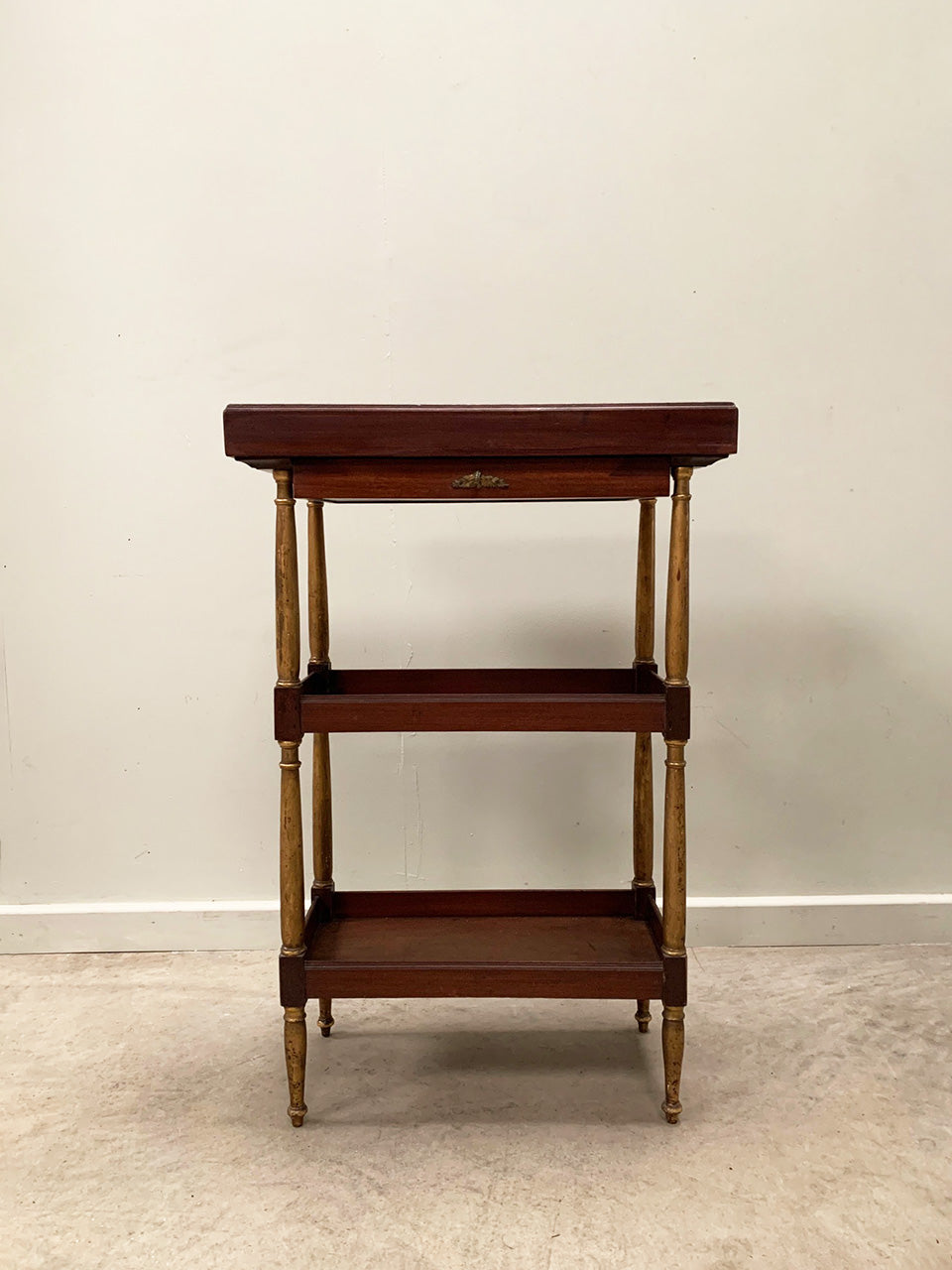Compact 19th century tiered console table with a single top drawer and galleried shelves.