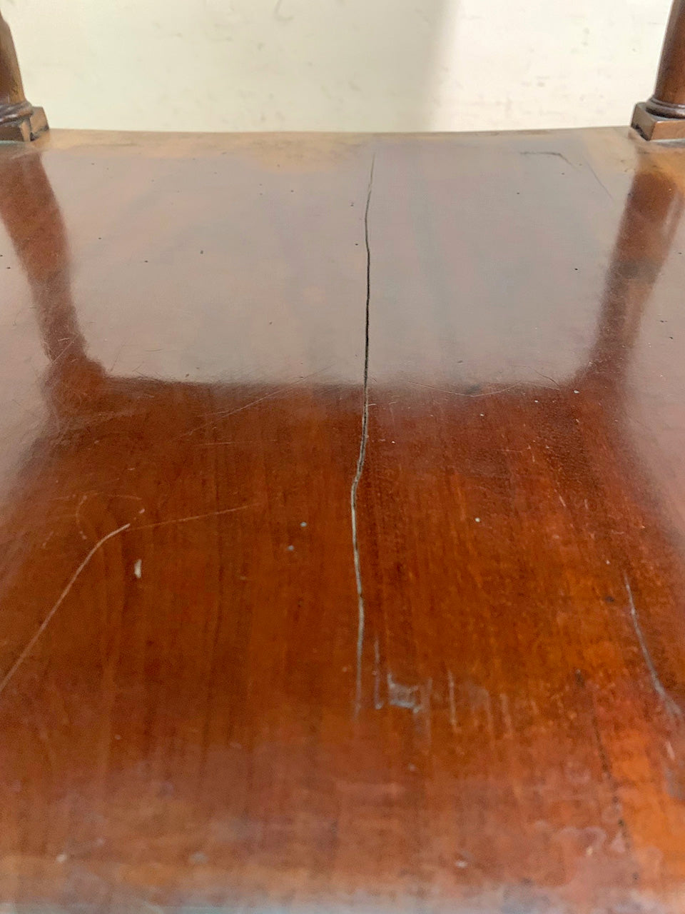 In used condition; the marble top has light scratches and the shelves have some splits.