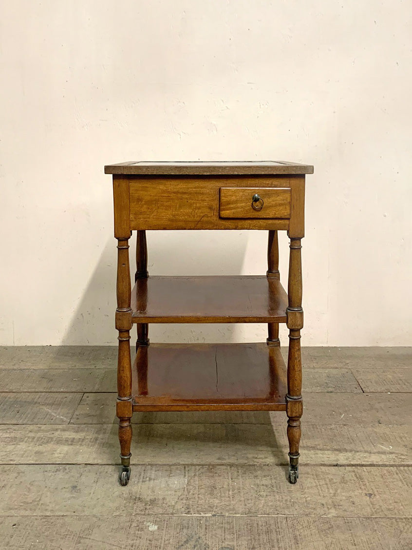 Grey marble top wine table in walnut, with a small single drawer for storing bottle openers and corks.