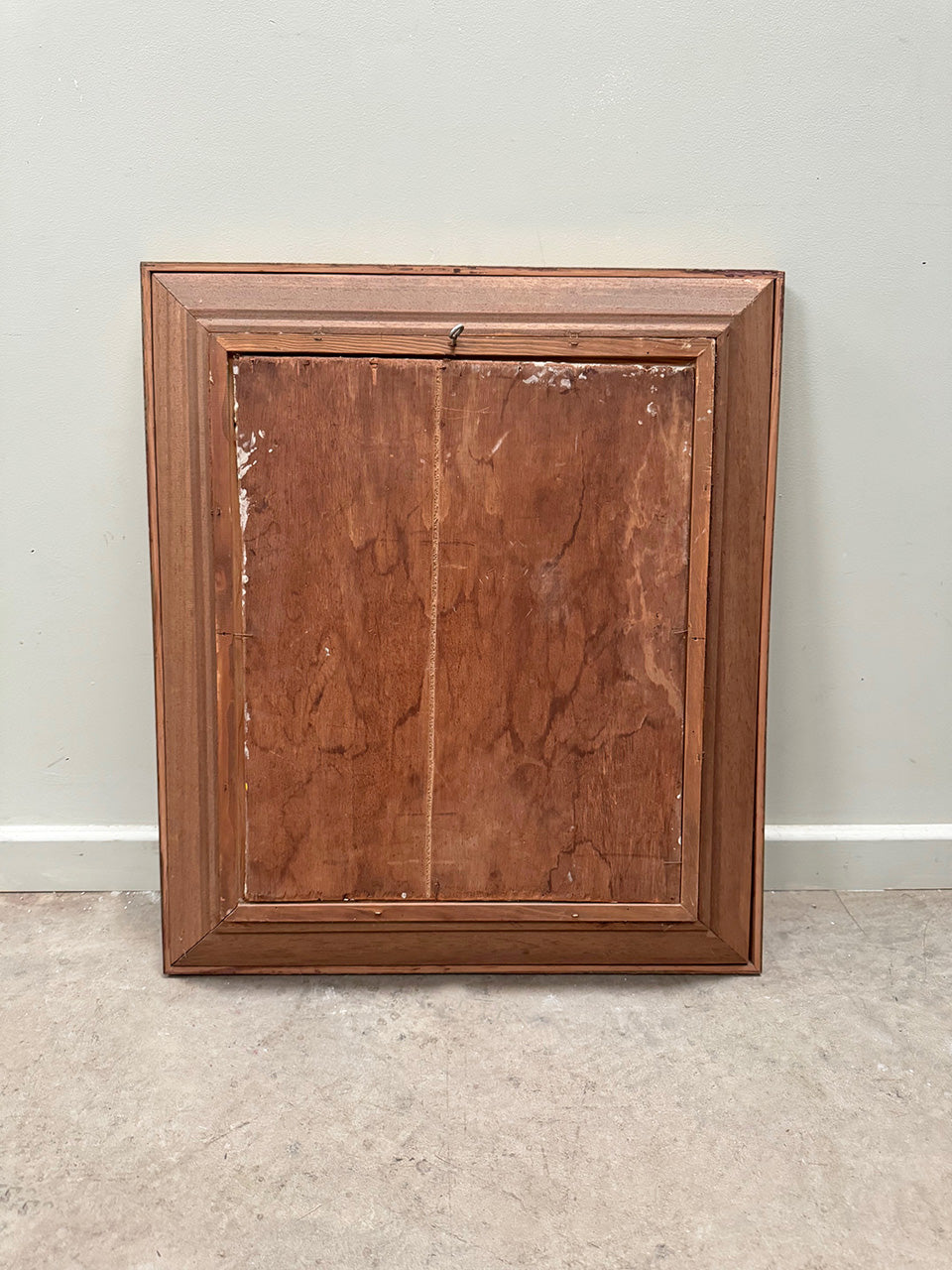 Set in a deep bevel frame in a hessian fabric, with a gilded finish around the outside of the frame.