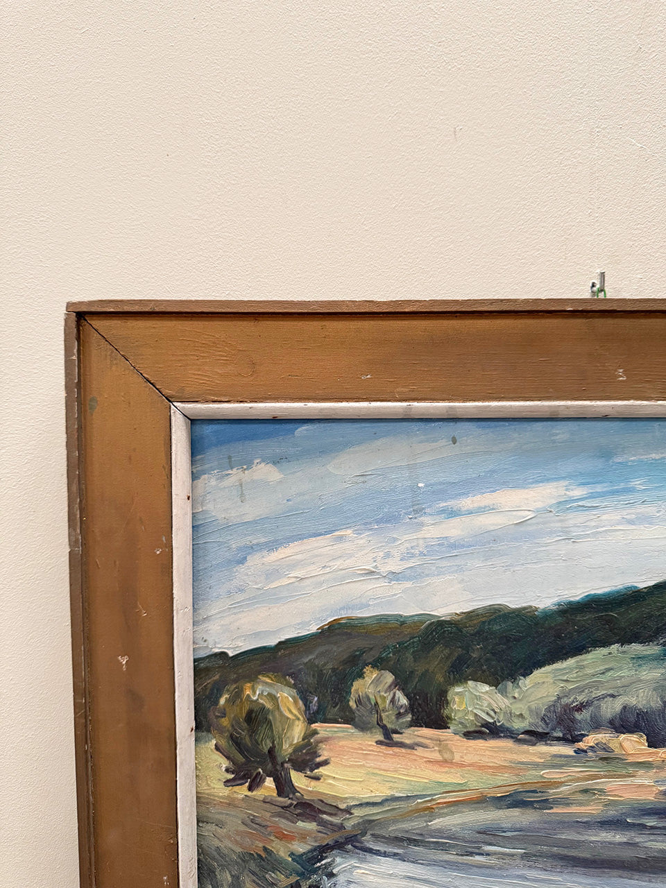 Mid-century landscape painting depicting a serene landscape painted in quick and thick strokes.