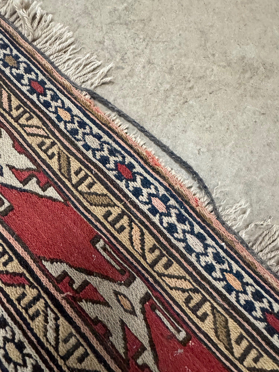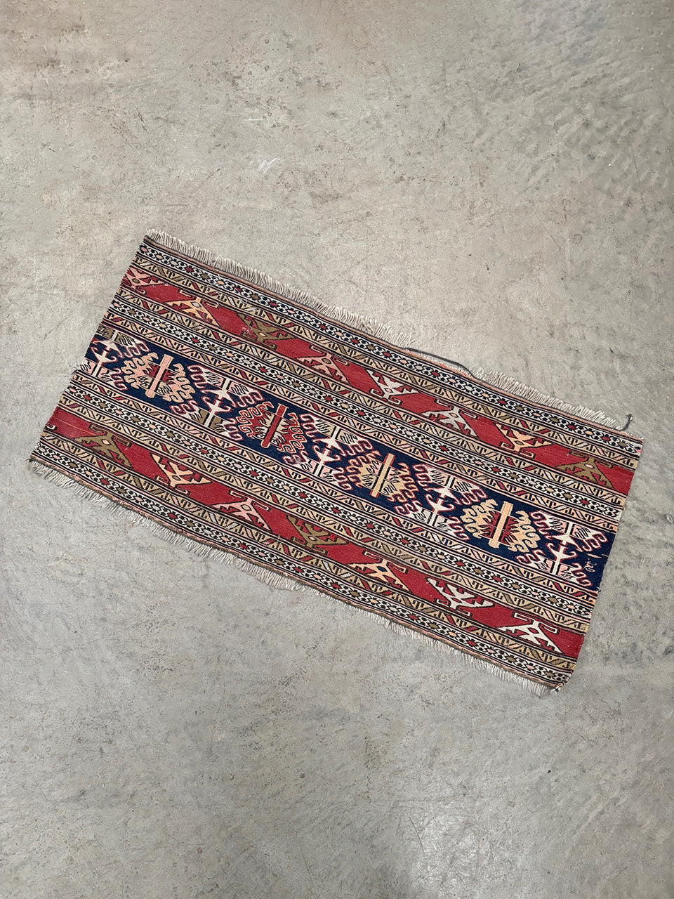 At around a meter long and hand made, the rug is predominantly in red, navy blue and white coloured cotton.